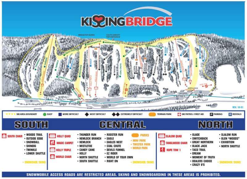 View the trails and lifts at Kissing Bridge with our interactive trail map of the ski resort. Plan out your day before heading to Kissing Bridge or navigate the mountain while you're at the resort with the latest Kissing Bridge trail maps.